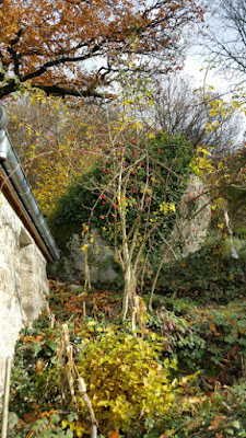 | liane de cynorhodon en fruits sur un aubépine dans la forêt jardin de Permaforêt à Uchon |
